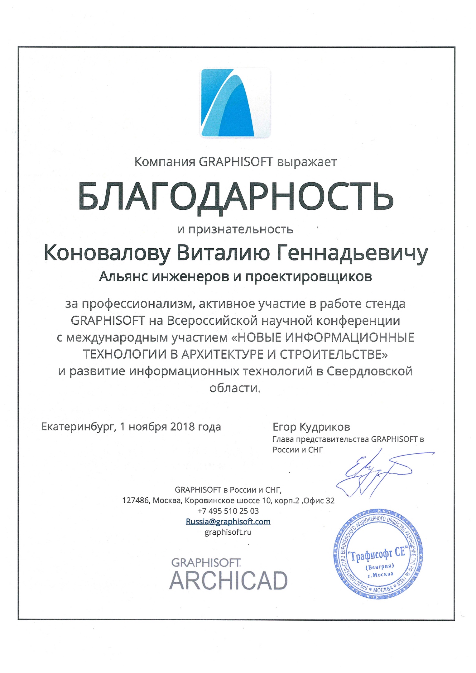 Компания GRAPHISOFT выражает благодарность и признательность Коновалову Виталию Геннадьевичу за профессионализм, активное участие в работе стендаGRAPHISOFT на Всероссийской научной конференции.